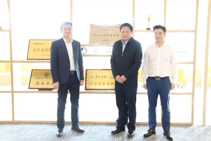 (图3:武汉市洪山区区长严中兴与升职猫董事长陈贤亮、CEO沈刚合影留念)
